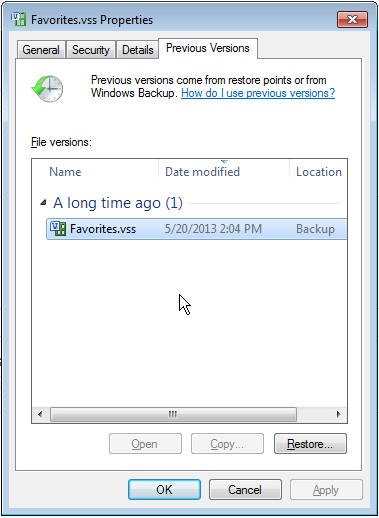 This will restore the older version of the file or folder in place of the existing file or folder. If you prefer to restore to a different location, press the Copy button and then specify the location you would like to place the file or folder